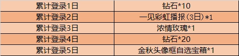 【金秋纪念宝箱】开启后,能从以下奖励中随机获取其一:铭文碎片*5、钻石*5、永久英雄或1日体验卡(英雄包括吕布、张良、虞姬、鲁班大师、李信)