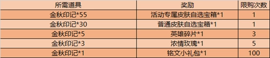 在活动期间,最多能够获取金秋印记*80 。若消耗55个金秋印记,就能兑换活动专属皮肤自选宝箱;要是消耗30个金秋印记,则可兑换普通皮肤自选宝箱(需注意,活动期间这2种宝箱仅能从中挑选一种进行兑换)