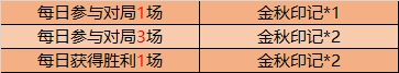 活动期间,通过每日对局总共可获得金秋印记*45。