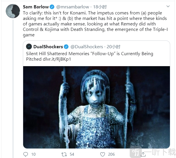 《寂静岭:破碎的记忆》的开发者Sam Barlow于推特上证实,近期将会着手尝试开发一款新游戏。同时,面对粉丝们的诸多疑问,Barlow特意作出澄清,明确表示Konami不会参与到该项目之中。