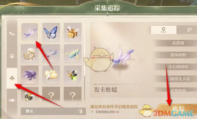 2. 在采集追踪页面,轻点左侧的昆虫选项,接着挑选发卡蚱蜢来开展追踪。