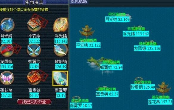 5、查看货物清单在港口商人处采办“未标记'完成’”的布匹。