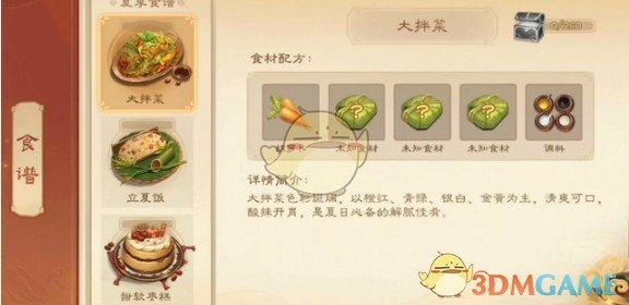 制作三国杀大拌菜需要哪些食材呢?今天要给大家分享的就是大拌菜的食谱。玩家得依据提示挑选正确的食材,才能着手烹饪。因此,务必提前准备好这道菜品所需的食材。接下来,就为大家详细介绍大拌菜都需要哪些食材吧。