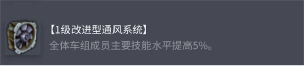 4、1级改进型通风系统:使全车组技能提升5%,全面强化射击、观察以及机动性。