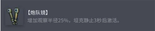 2、炮队镜(观察镜):同样需静止3秒激活,激活后观察范围增大25%,与伏击战术搭配,可抢在敌人之前发现目标。