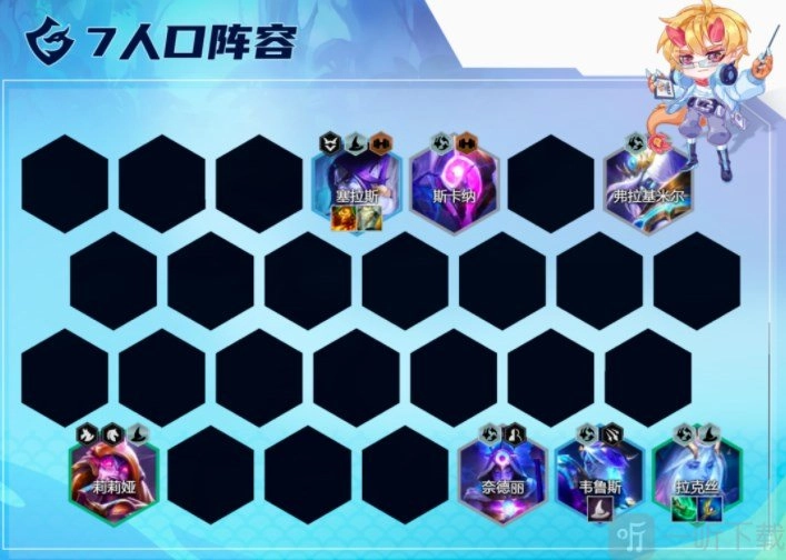 今天在对局里,碰到了一种全新的7法思路,核心是培养3星拉克丝。在当前版本,拉克丝得到了增强,配备三件输出装后,释放两次技能便能秒杀大部分敌方棋子。个人感觉,这种玩法在强度上要高于培养诺姆希。而且只要站位得当,对阵四龙阵容也相当稳健。