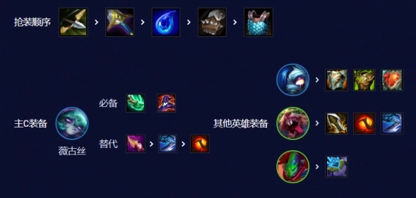 前期建议用塞纳或安妮携带薇古丝的装备来过渡,这套阵容最好是在有双喜临门这个条件时再玩,要是正常玩的话,强度是不太够的。