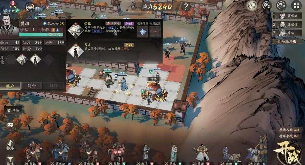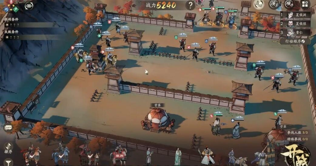 开场一定不能让典韦挪动,这一点至关重要。在第一回合结束之际,贾诩会施展“尾爆”与“松懈”技能,要是典韦此前移动过,就必定会中此招,如此一来基本上就必输无疑了。正确的操作是让典韦留在原地,先让其他武将行动。夏侯渊能够往右行进两步,运用“连射”技能去攻打距离最近的枪兵,夏侯惇则向左移动,做好拦截敌人的准备。当第一回合结束时,务必要保证典韦所处位置,敌方弓箭手无法对其进行攻击。