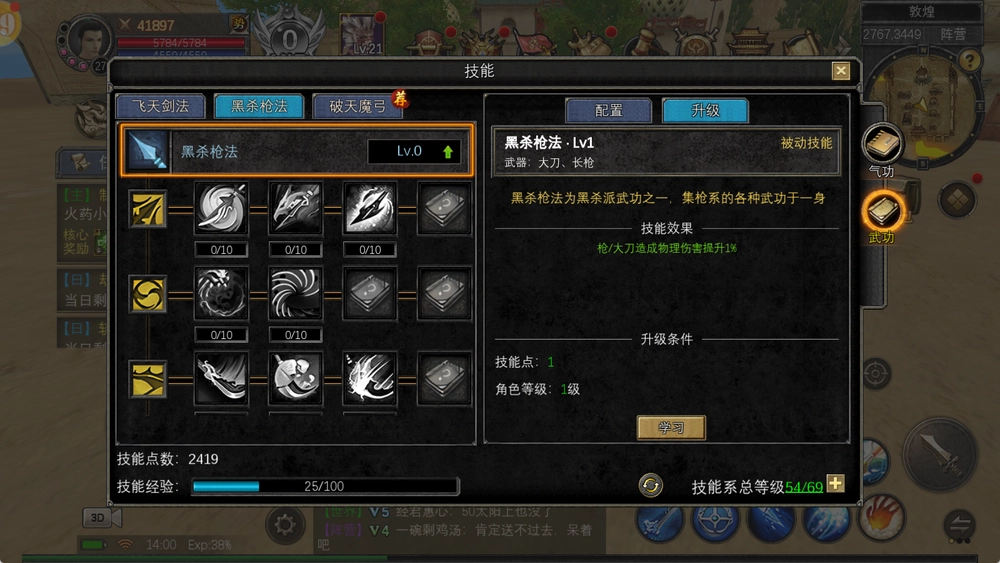 技能体系深入解析,黑杀枪法涵盖多个强力技能,各技能皆具备独特的效果与用途。破甲突刺作为起始技能,拥有三段式攻击,可造成高达210% + 380的物理攻击伤害,同时还附带使目标防御降低25%的破甲效果,该效果持续8秒。