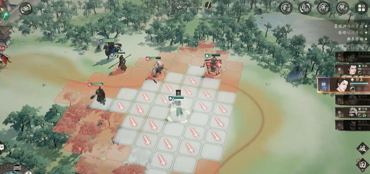 在游戏开局时,推荐选用典韦、张郃、许褚、郭嘉以及夏侯惇组成阵容。具体站位方面,将典韦置于最前排的正中间,张郃与许褚分别安排在典韦的左右两侧,如此便能构建出三角防御阵型。而郭嘉和夏侯惇则放置在后排作为输出,尤其要留意,需让郭嘉站在一个不会被吕布直接攻击到的角落。在第一回合进行移动操作时,要使三位近战武将各自朝着不同的敌方小兵靠近,目的是为第二回合触发合击创造有利条件。同时,别忘了把夏侯惇移动到能够攻击到两个敌人的位置,这样会更有利于触发连携攻击。