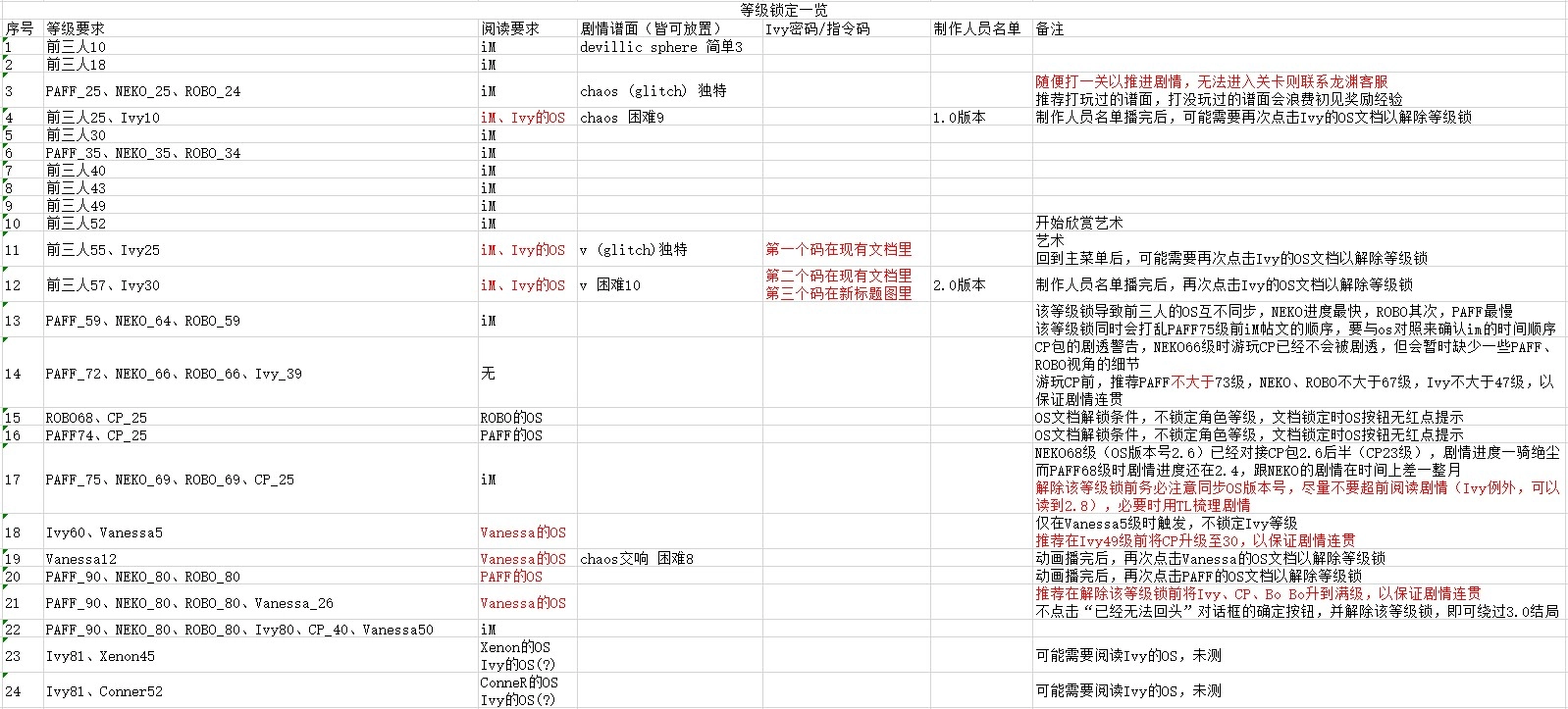等级锁一览、指令码密码提示