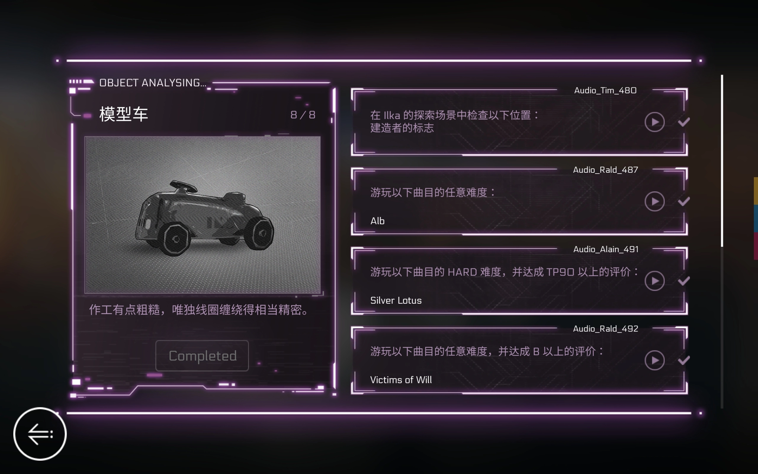 完成右侧全部特定任务,就能解锁一首曲子。需留意,部分人物曲包包含两个任务界面,分别对应两首曲子,请注意仔细寻找其中的差异。