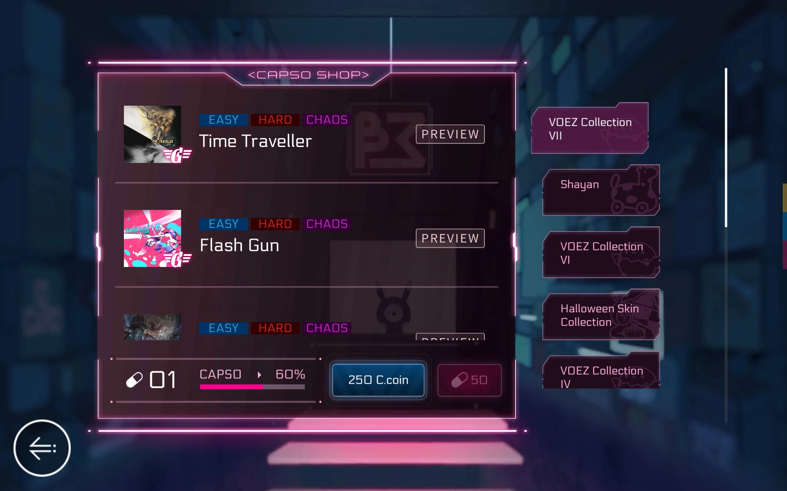需花钱解锁,查看曲子上方对应的标识,就能知道解锁曲子所对应的人物。比如上图的第一首曲子,便是neko的曲子。要留意的是,只有购买的人物DLC配备了相应的人物曲包,才能够进行游玩。
