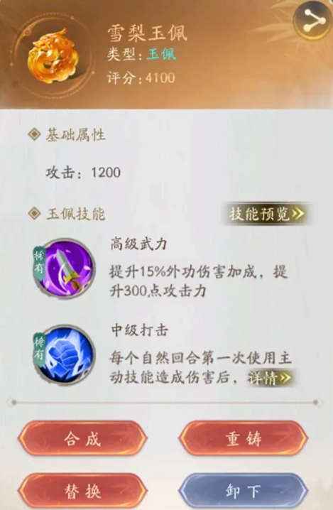 1. 侠客身上所穿戴的玉佩,点击后能进入玉佩界面,在此界面可进行合成或重铸操作。