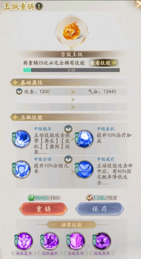 4、倘若合成玉佩的技能或属性不尽人意,可借助玉佩重铸来改变属性与技能。重铸时需耗费一定数量的玉石和铜钱,且玉佩品质越高,所消耗的玉石和铜钱也就越多。