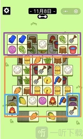 1. 羊了个羊11月8日当天,悬浮区位于上方,主消区下方隐藏着4+3旋转楼梯。