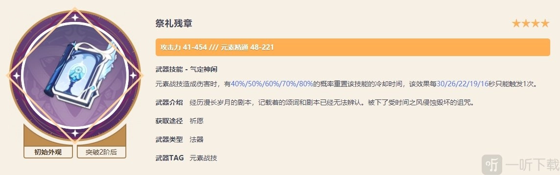 祭礼残章虽说其被动技能作用不大,但无论是攻击力还是元素精通的基础数值都更高,并且它的泛用性也更强一些。毕竟魔导绪论鲜有人使用,而四星的祭礼残章却有不少人能用得上,如此一来,我们强化武器所消耗的矿石起码不算白费。