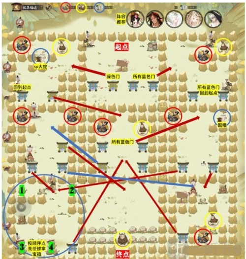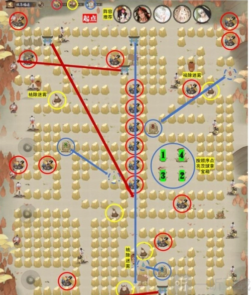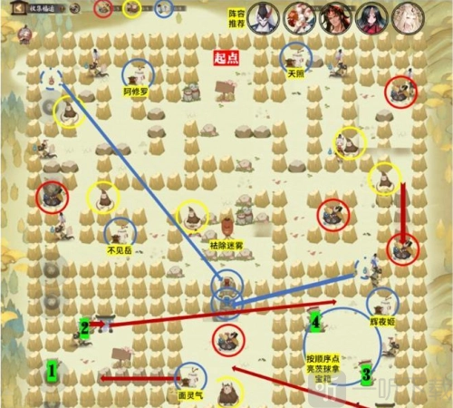 8. 探索地图,借助收集式神、组建队伍、与怪物战斗、探寻路线、按顺序点亮茨球以及收集鬼火解锁封印等多种玩法,完成从起点至终点的关卡解密。