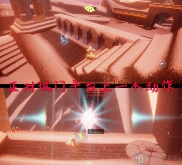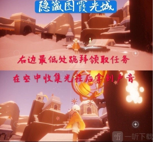 7、获取声音动作的具体操作藏于隐藏图中:在霞光城,点击右侧最低处进行跪拜以领取任务,随后在空中收集光柱,完成任务后即可领取声音动作。