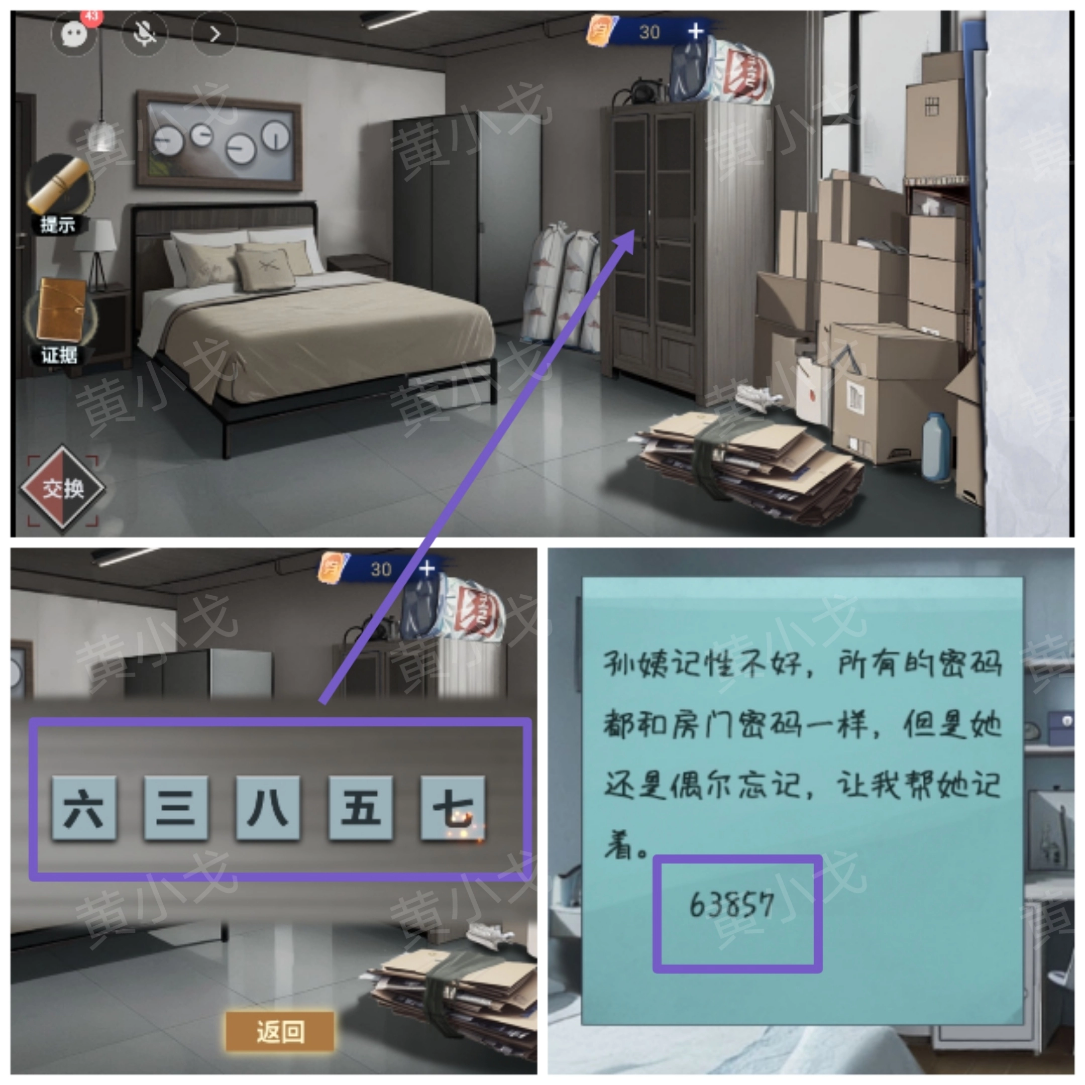 8. 轻点柜子上的密码锁,依据队友提供的线索,输入密码:63857