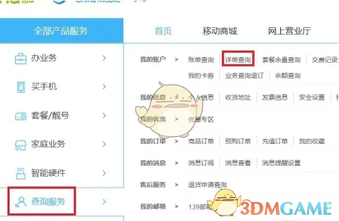 1. 打开中国移动网上营业厅的官方网站(www.10086.cn),登录个人账号。登录成功后,在页面左侧的列表中进行点击操作,从中挑选“查询服务 - 详单查询”这一选项菜单。