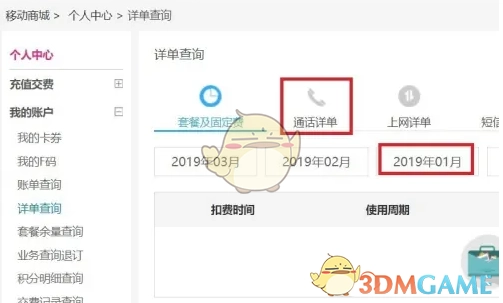 2、进入详单查询页面后,点击页面顶端的“通话详单”菜单项,接着点击选择需查询的月份。