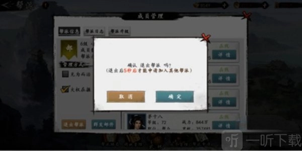 第二步:进入【帮派】页面,随后点击【成员管理】选项,这时会弹出【成员管理】对话框,在对话框中点击【退出帮派】功能按钮。