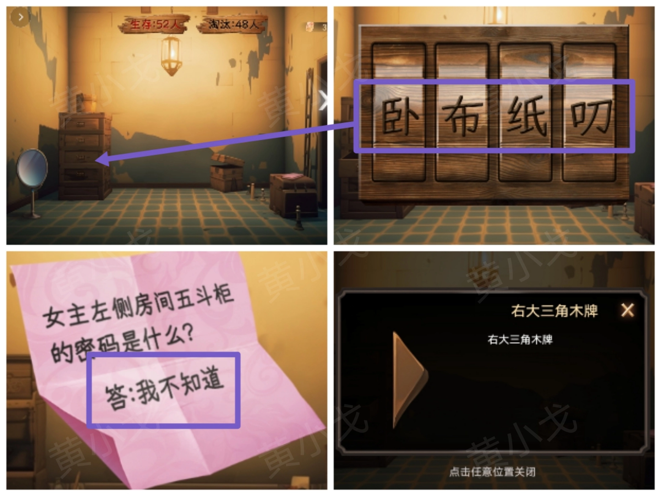 8. 轻点五斗柜上的密码锁,依据男主所发现的线索,输入密码“卧布纸叨”。随后成功打开柜子,从中获取【右大三角木牌】