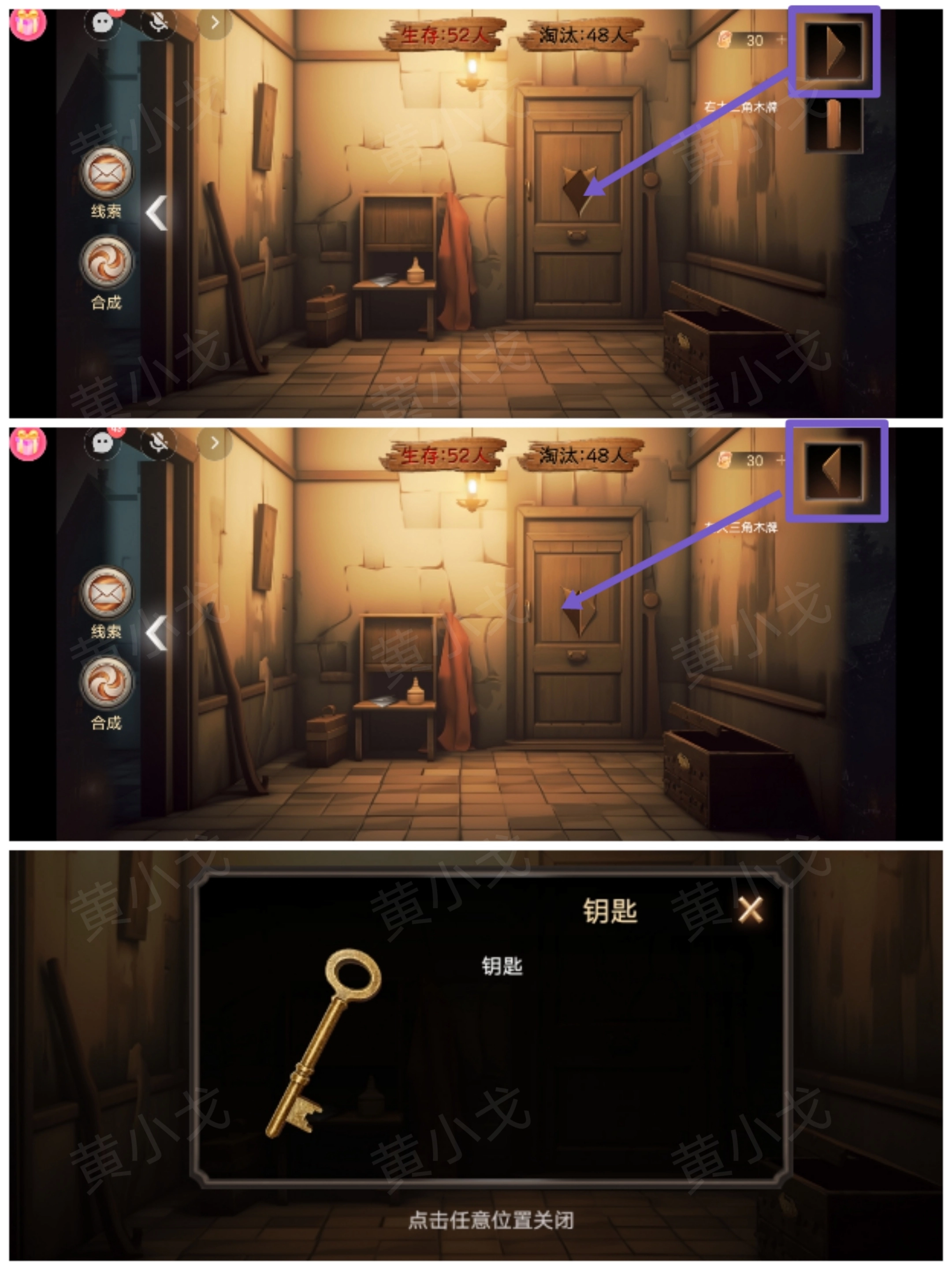 10. 将【左小三角木牌】、【右小三角木牌】、【右大三角木牌】以及【左大三角木牌】放置在大门拼图之上,从而获取【钥匙】。