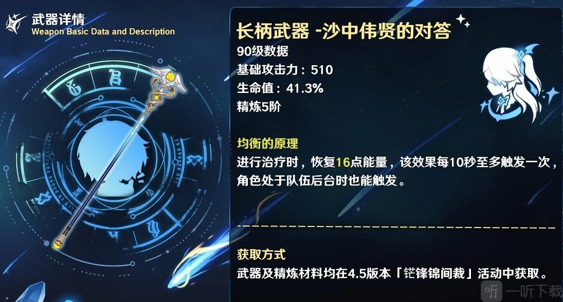 瑶瑶能够携带这把武器,它41.3%的生命值比黑缨枪的46.9%要低,不过好在它无需额外花费且能回复能量。而且在当前版本活动期间,锻造沙中伟贤的对答还能享有优惠。在充能需求方面,沙中伟贤的对答没有西风长枪那种为全队提供能量的效果,所以必要时更推荐使用西风长枪。要是大家西风长枪的储备不足,这把武器在许多情形下都能满足实战要求。并且,当这把武器搭配少女瑶瑶,说不定哪天还真能摇身一变成为魔法少女呢。
