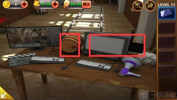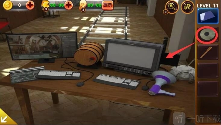 2、轻点桌子,打开光盘,同时获取木桶上的第二条提示。