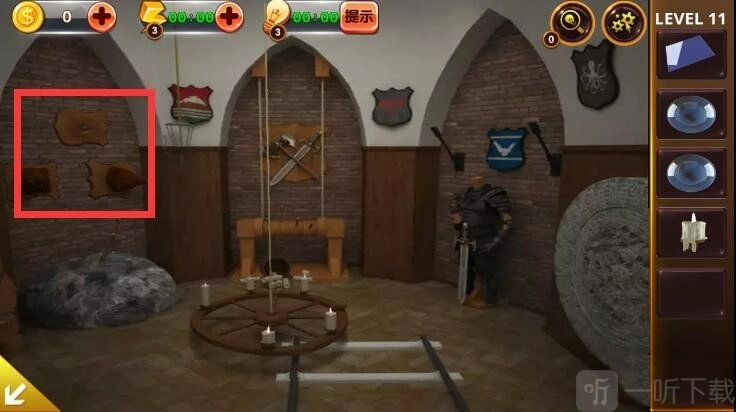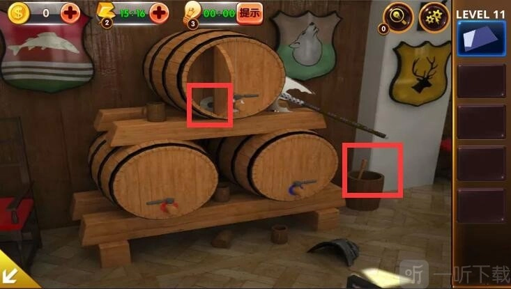 1. 轻点角落里的盔甲,获取卡片以及木桶上的提示信息。