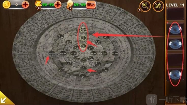 10、按照提示转动右侧石牌,使大圈的数字4朝左,中间圈的数字1朝下,小圈的数字8朝上,最后把三颗球放置到黄色圆圈内就能过关。