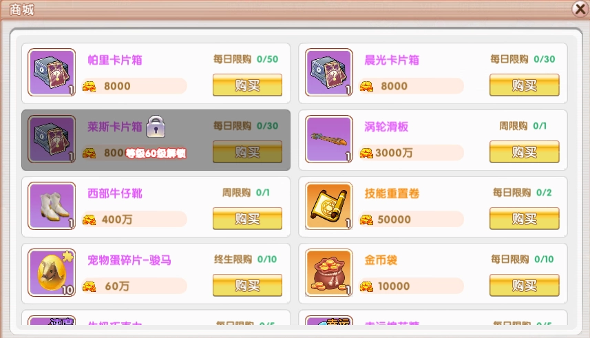 商城选购:玩家能够用钻石购买高级卡片宝箱(开出B级卡片的概率较高,获得A级卡片的概率极小),也能用金币购买普通卡片宝箱(主要产出C - B级卡片) 。