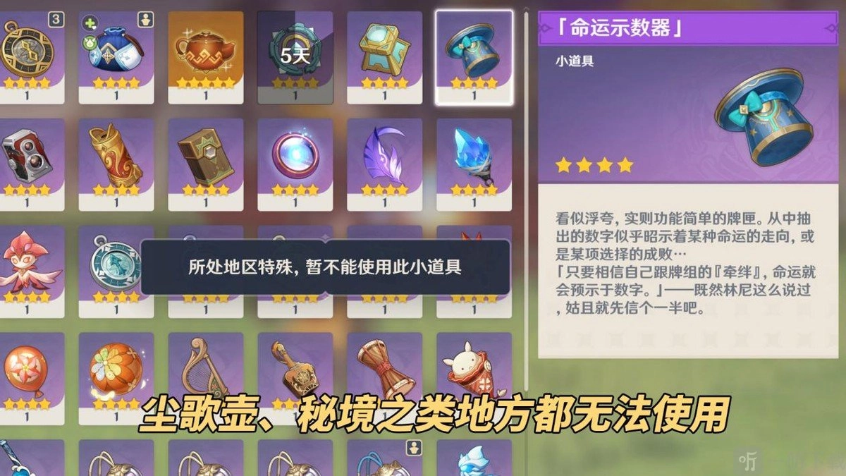 ③尘歌壶能不能用呢?答案是不行。它会直接显示“地区特殊暂不能使用此小道具”,这和大家背包里的烟花筒情况一样,都存在环境限制,就算是秘境这类地方也不例外。挺可惜的,一些玩家自制的飞行棋、跳格子等玩法就此泡汤了。