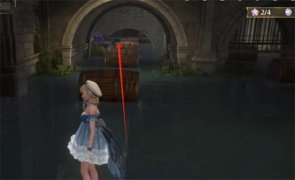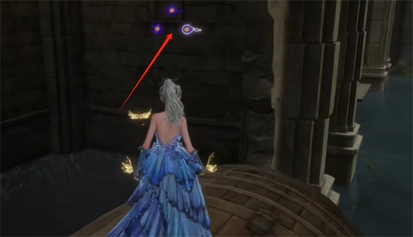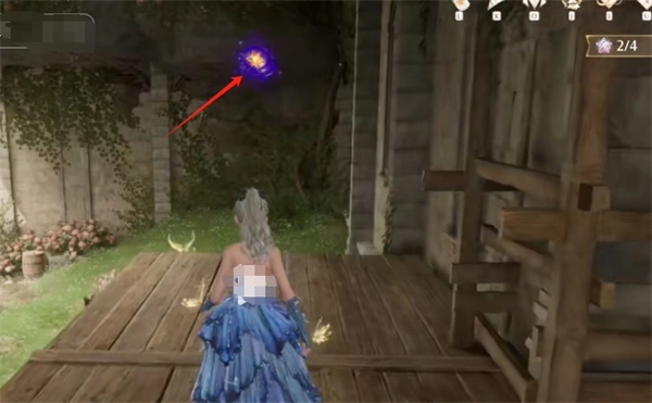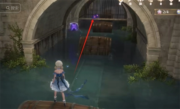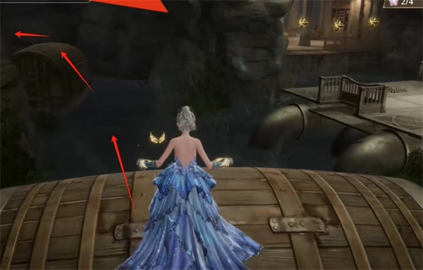 穿过洞后,朝右边看,跳到之前第一排的木桶上,接着往右边的洞口转一转,就能拿到2颗灵感露珠,随后往左边的平台跳上去。