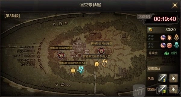 1.进罗特斯房间前(图里点进度表也可以),记得开攻坚BUFF,队伍BUFF开给配置更高的一队,收益更高。