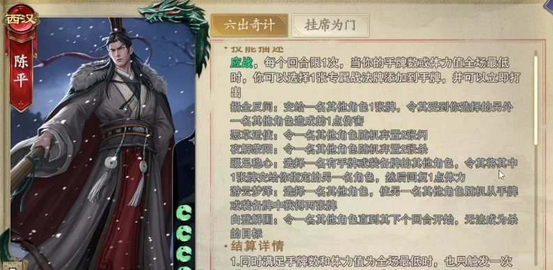 六出奇计作为应战技能,虽有局限,但并非毫无价值。实战中,不应仅将其与马超、轩辕剑等武将作比较,而要从陈平自身技能体系及团队协作的角度综合考量。比如,在与队友协同作战时,队友能通过出杀协助陈平触发六出奇计。并且,陈平的捐金反间、恶草近使等其他技能,在应战过程中同样能发挥一定功效,并非完全无用。