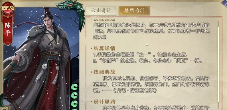 当陈平的手牌数量在全场处于最低水平时,他的一技能“挂席为门”便会生效,使其获得防御能力,无法成为其他角色战法牌的目标。不仅如此,在其他角色打出战法牌后,陈平还能够获取一张该牌的复制。此效果为他提供了扩充自身手牌资源的机会。