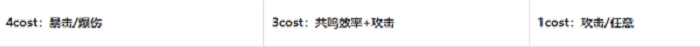 在声骸主词条的选择上,cost4可选取暴击率或者暴击伤害;cost3能选择共鸣效率或者攻击力;而cost1则选择攻击力。
