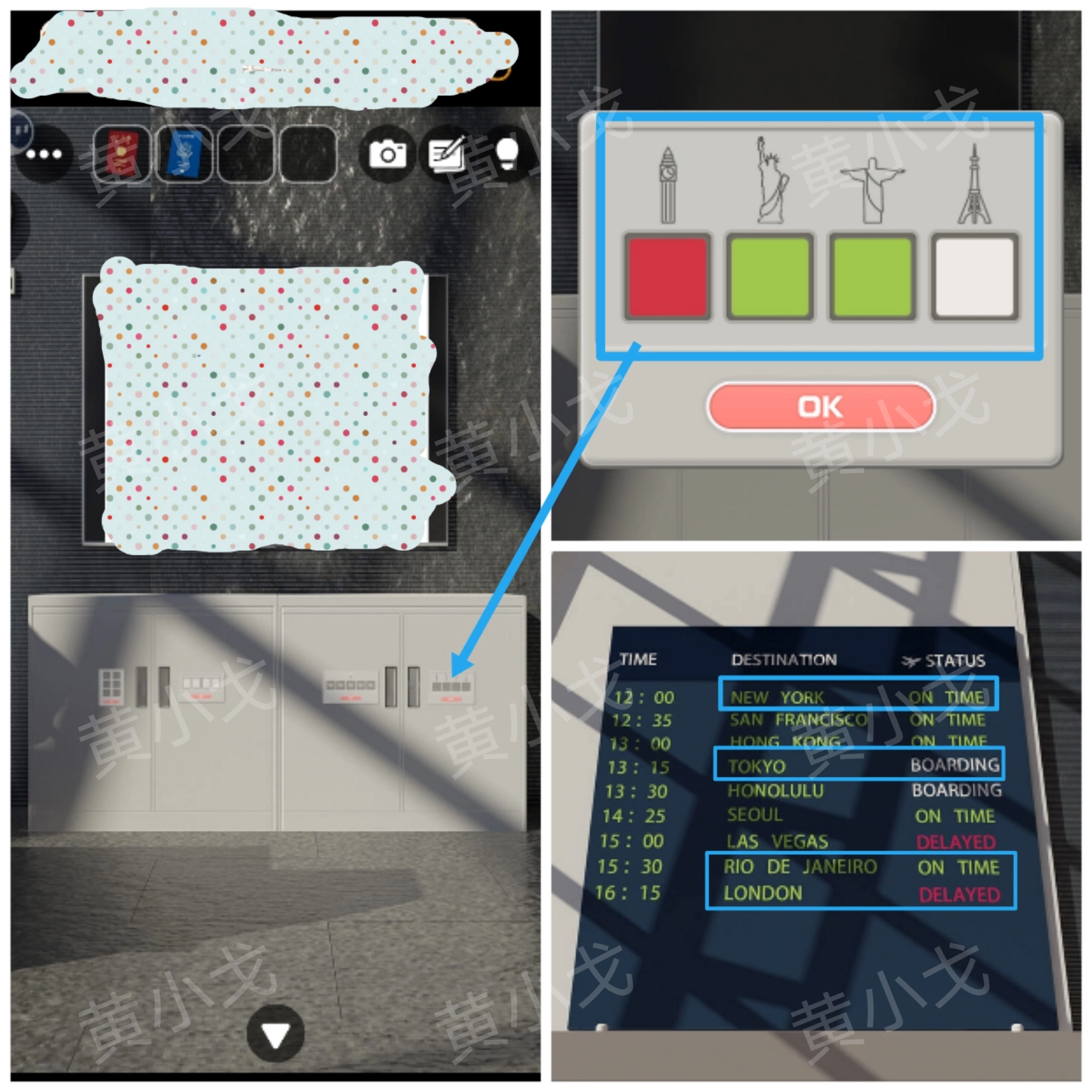 显示屏呈现的线索如下:NEW York(纽约),值机状态为绿色;LONDON(伦敦),值机状态为红色;RIO DE JANEIRO(里约热内卢),值机状态为绿色;TOKYO(东京),值机状态为白色。