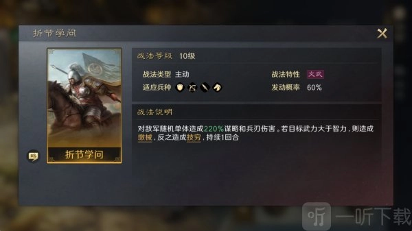2. 《文攻》:其自带战法“折节学问”会将造成的兵刃伤害转化为谋略伤害,并且此战法的伤害提高10%