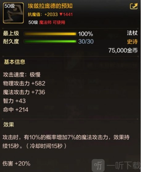 相较于另一把法杖所具备的“爆伤增加25%”属性(此属性对暴击数值存在一定要求),这把武器直接增加20%伤害,表现更为稳定。而且它超高的面板加成,再搭配上“攻击时10%概率增加7%魔法攻击力”这一提升效果,使其成为元素师职业最为稳定的武器。