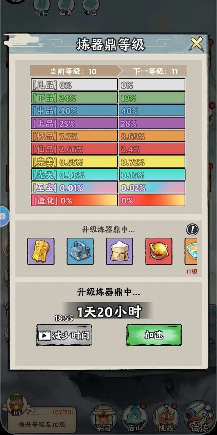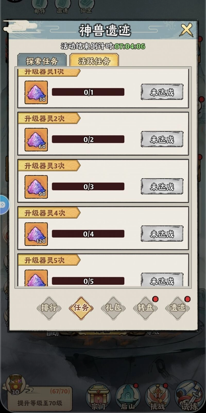 4、全力开启箱子(建议斩妖角色选择扫荡5次,别舍不得灵玉)。这时炼器鼎能从9级提升到10级,甚至可以从10级提升到11级,人物等级甚至能升至66级或者67级(65级主线任务中的精炼环节可以做,仅针对任务;遗迹活动里精炼20次、30次不建议做,没什么价值;除非运气绝佳,器灵召唤20次的任务,有可能使器灵升级2次。因为通过这种活跃任务获取的神兽残痕,足够支持快速挂机2次)。