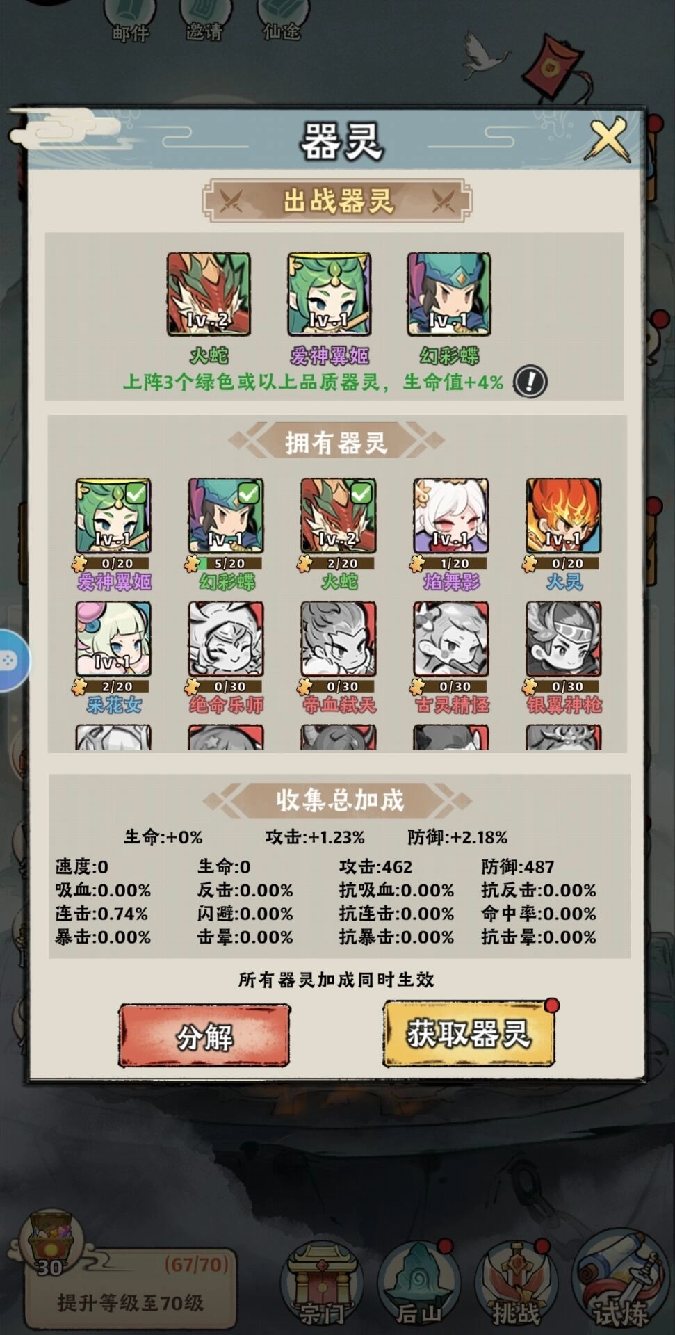下面这个号是我用来做素材的小号。在装备方面,前期我选择了连击。功法则挑选了青云剑诀。由于器灵数量较少,火蛇是必选的(等器灵活动开启后,看看能抽到哪些优质器灵,再对流派做出调整)。炼器鼎目前正处于从10级升至11级的阶段。人物等级已经提升到了67级。精炼次数达到了30次(这算是个反面例子,除非器灵能够升级才值得这么做)。因为运气实在太差,进行了20次器灵召唤都没抽到好的,致使剩余的神兽残痕不足4000,仅仅够勉强快速挂机一次。另外,器灵任务我一个都还没做,打算囤着引魂珠,留到开服第五天的时候再大量使用。