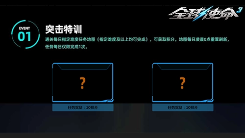 从即日起至12月22日,突击特训环节将推出“英雄模式&末日求生”与“火线突袭”两大挑战擂台。每座擂台会依据自身名称,同步上线《全球使命3》PVE模式里的对应地图。玩家可登录官方网站的活动页面,查看每日更新的地图详情,更新时间为每天凌晨0点。只要成功通关当日指定难度的任务地图(达到或超过指定难度即可),就能获得该任务对应的积分奖励。每个任务每日仅能完成一次,单个游戏角色每日最多可获取20积分。