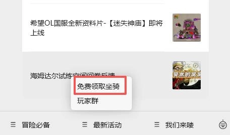 获取这份专属福利的步骤既简单又富有仪式感:您只需先打开《希望OL》,找到底部菜单栏的【最新活动】选项,再点击其中的【免费领取坐骑】。接着在跳转的页面里完成游戏账号绑定,之后回到公众号聊天界面,输入指定口令“领取公众号专属坐骑”,就能获取坐骑的专属兑换码啦。