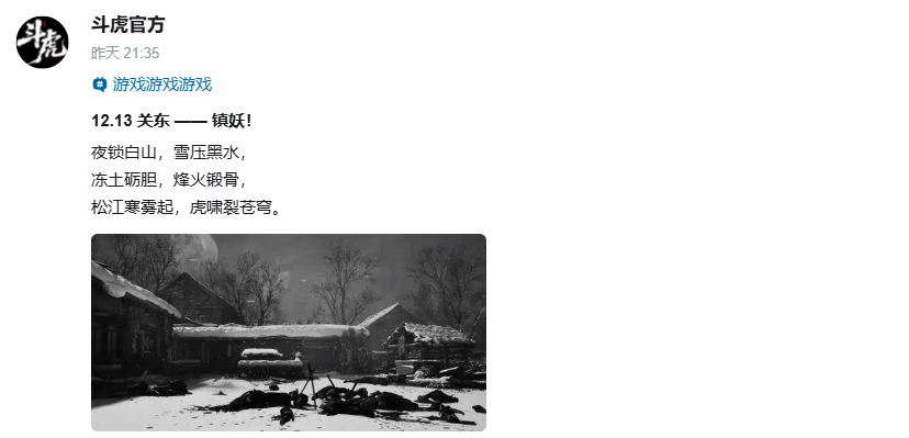虽然距离正式发售还有将近三年,但开发团队一直保持着活跃状态。12月4日,《斗虎》的官方B站账号发布了一条神秘动态:“12.13 关东——镇妖!”,这一动态引发了玩家们的广泛猜测。联系到“关东”所指代的日本关东军,以及“镇妖”暗含的铲除侵略者的历史背景,许多网友觉得这大概率是新实机预告片或者重大内容更新的倒计时预告。