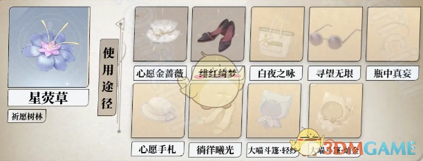 可制作道具:能够制作心愿金蔷薇、午后暖阳、迷你星芒、别离花客、星愿璀梦、白夜之咏、小鱼丸