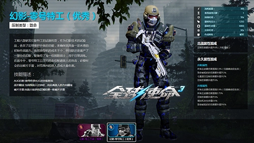 作为可培养的作战单位,幻影-零号特工具备完整的属性成长机制。三大核心技能兼顾攻防两端需求。核心攻击技能“AUG扫射”凭借传承武器的稳定性,可对目标进行精准且持续的火力压制,特别适合对付中近距离的敌人集群。在遭遇包围时,“战术翻滚”技能能够帮助其向远离敌人的方向快速突破包围,为重新调整战术姿态赢得关键时间。终极清场技能“破片手雷”是扭转战局的关键手段,向敌人密集区域投掷后,通过大范围爆炸伤害能给目标造成重创,搭配玩家的主力输出可以迅速冲破敌人防线,与《全球使命3》快节奏的战斗风格高度适配。